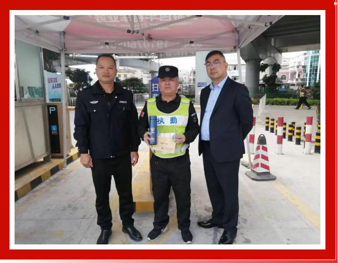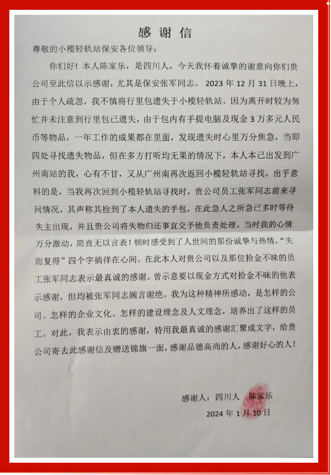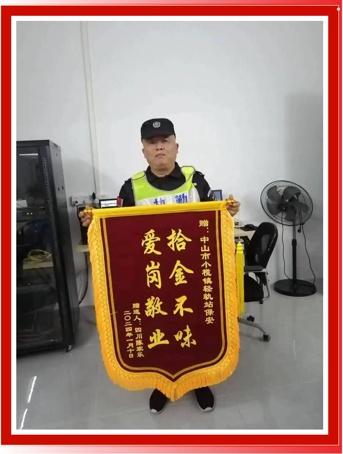 2023年12月31日晚上11点钟左右,华威保安公司派驻到小榄轻轨站岗位值班的保安员张军在值班巡逻过程中拾到一个背包,打开背包后发现里面装有3万多元人民币、平板电脑一台以及衣服等物品。这时候张军第一时间将事情的经过上报了单位上级,并积极查找失主。经过努力排查,很快找到并联系到了失主,并将款物完整无缺地交还给了失主,使得失主挽回了几万元的经济损失,后来失主为表感谢送来一面锦旗及感谢信。
