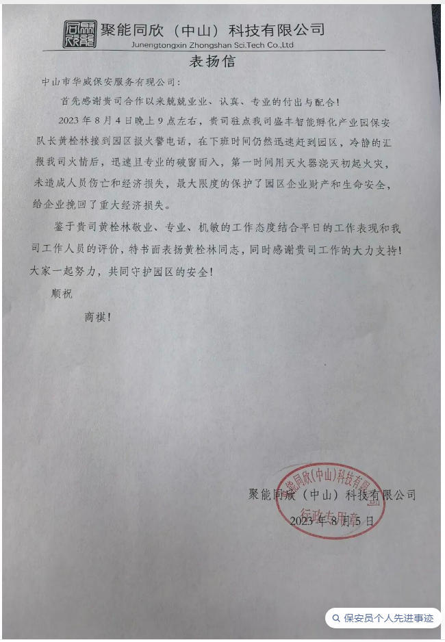 2023年8月4日晚上9点左右,华威保安公司驻点盛丰智能孵化产业园保安队长黄栓林接到园区报火警电话,在下班时间仍然迅速赶到园区,冷静地汇报园区火情后,迅速且专业地破窗而入,第一时间用灭火器浇灭初起火灾,未造成人员伤 亡和经济损失,极大限度地保护了园区企业财产和生命安全,给企业挽回了重大经济损失。